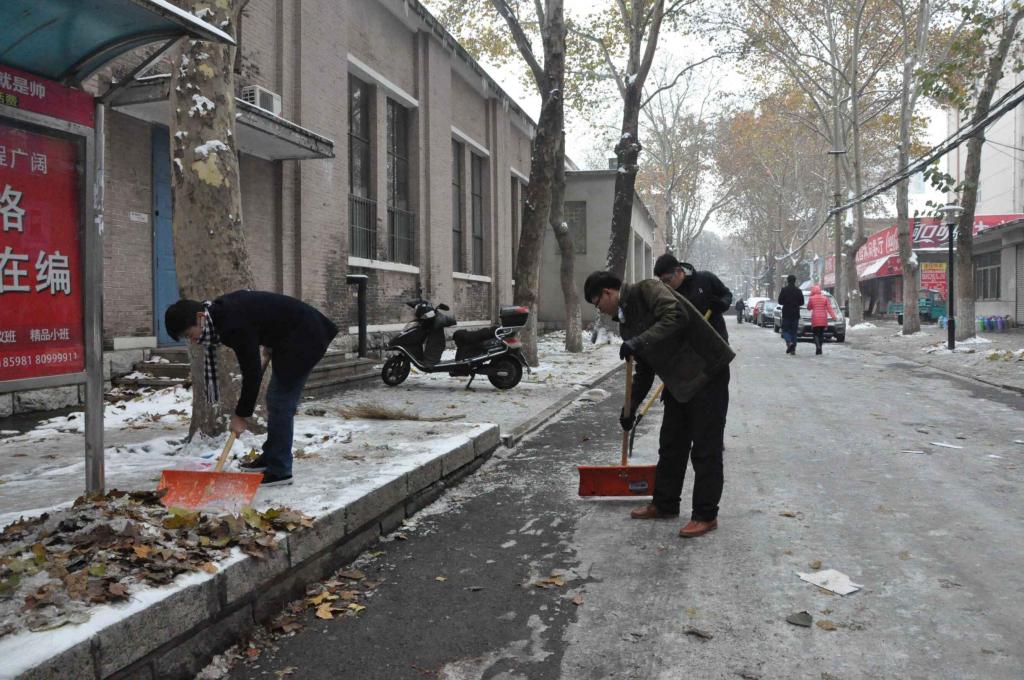 上午8时许,部分没课的同学便在五号宿舍楼前集合。随着扫雪工具的到位,同学们自行分组,各自领取了扫帚、铁锹和推雪铲等工具,以小组为单位,积极投入到扫雪铲雪的工作中来。同学们先用推雪铲把路上的雪尽力推开,露出下面踩实的雪、冰等,而后用铁锹把下面的冻在路面上的冰铲掉。拿扫帚的同学最后再把碎冰扫到路边树底下等不妨碍行人走路的地方。同学们动作整齐划一,按步骤协调有序地进行着扫雪铲雪工作。虽然寒风凛冽,但同学们扫雪的热情不减。某些路段冻在路面上的冰极其难铲,同学们不畏艰难,一起动手,用铁锹一点点敲碎。老师们也与同学一同动手。相对于同学们,老师们则更有经验,扫雪动作更加娴熟迅捷。扫雪现场一片努力劳作、热火朝天的景象。最终,在化学院师生共同的努力下,于上午11点时,化学院在大礼堂东路到南门,一号宿舍楼前到红烛园,四号宿舍楼前及其西路,九号宿舍楼前及翰林西路等大段道路开辟了安全道路。晚间5:30到7:30,2013级化学院党员与入党积极分子再次对道路进行维护。