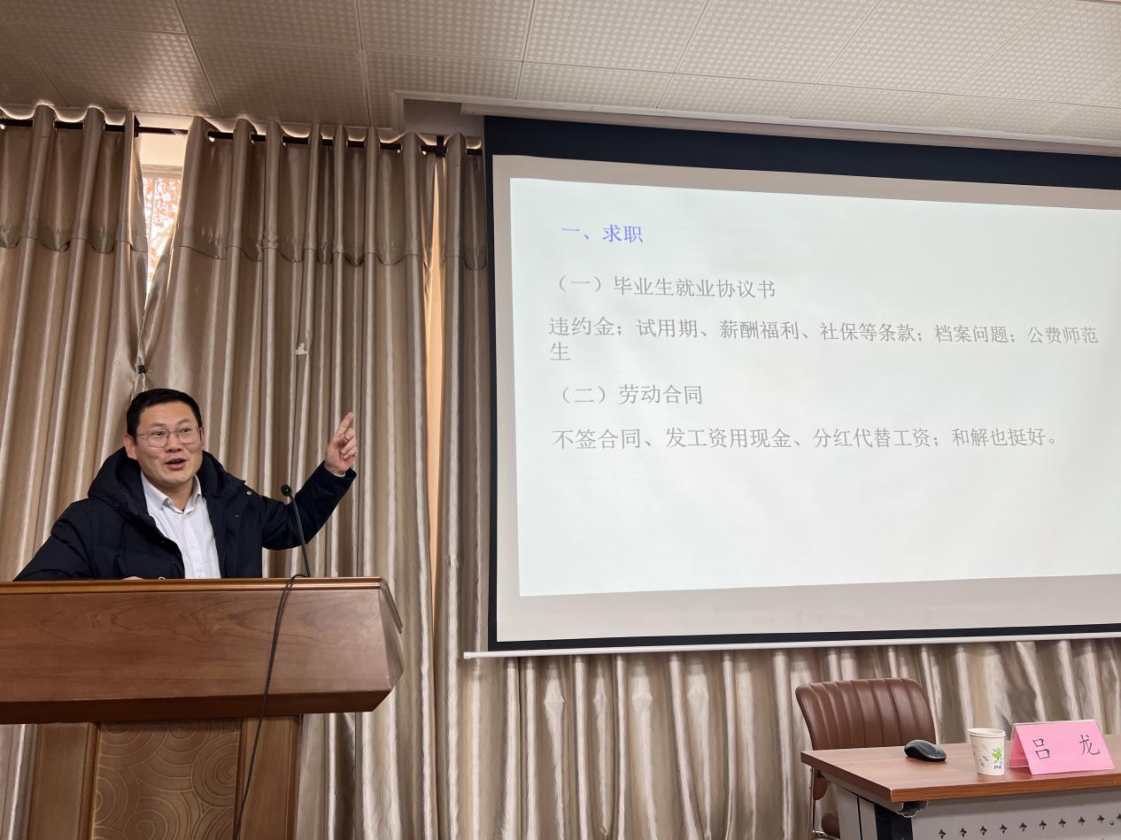 为更好的促进学生高质量就业,12月27日上午,英国365上市公司于一号教学楼1201报告厅举办“法”护人生,筑梦职场——普法青春行系列活动,此次活动邀请校长办公室法律事务室副主任吕龙主讲,学院毕业生积极参与活动。