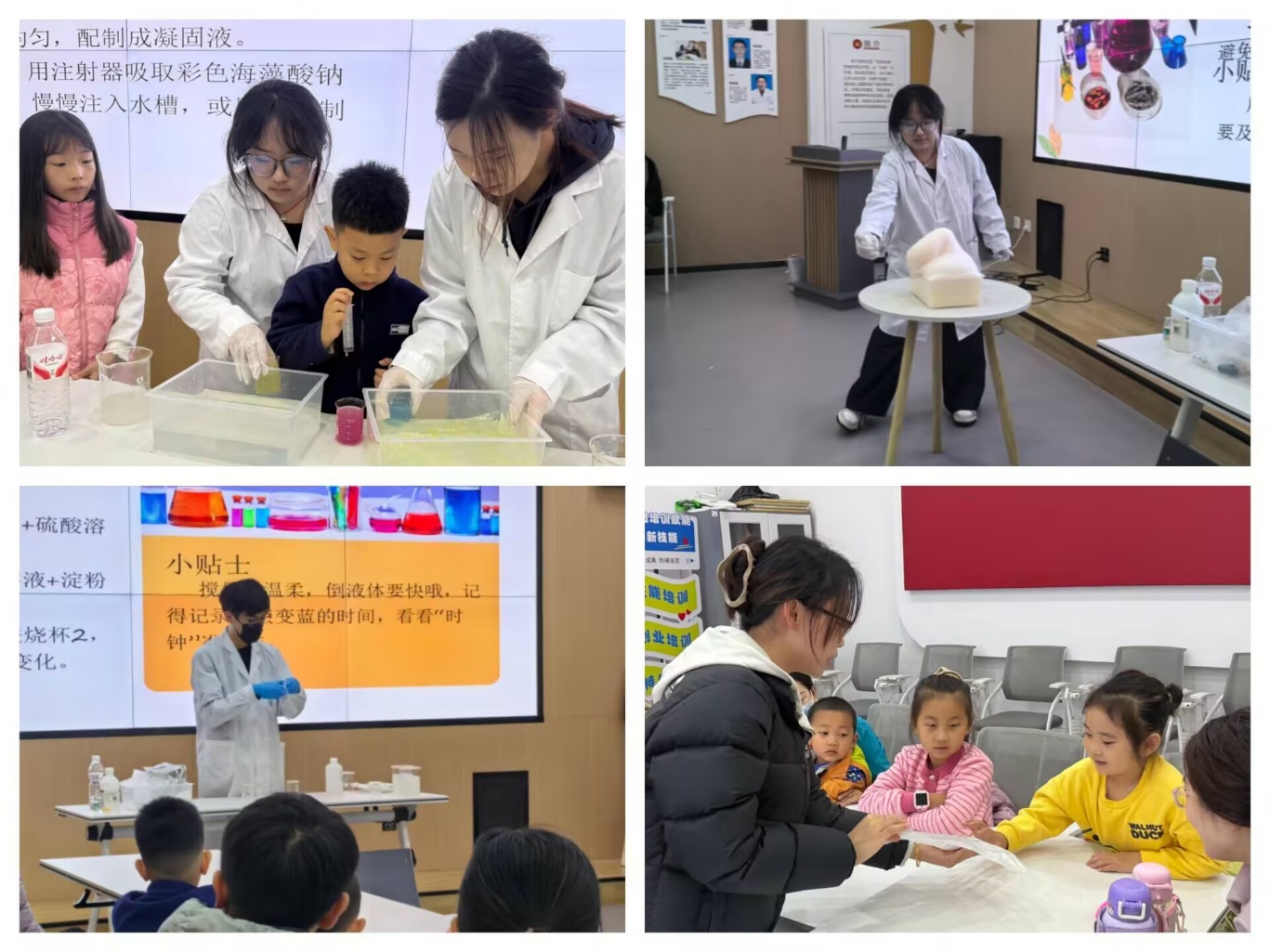 讲座结束后,实践环节将活动推向高潮。“魔力泡泡秀”实验里,试剂混合后喷涌的泡沫让同学们直观感知催化剂作用;“碘钟实验”中溶液定时变色,尽显化学反应的精准奇妙;“丝线魔法”里,志愿者们用简单的试剂将液体变成丝线状的固体,同学们玩的不亦乐乎。志愿者们还邀请部分孩子参与操作,沉浸式体验实验乐趣。