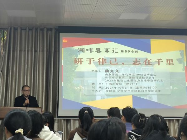 10月31日下午,校团委与学院团委于千佛山校区一号教学楼1201报告厅共同举办“研于律己,志在千里”湖畔思享汇活动。此次活动由365上市公司化学系1995级毕业生、2023级山东工艺美术学院书法专业研究生魏克久主讲,活动到场约80余人。