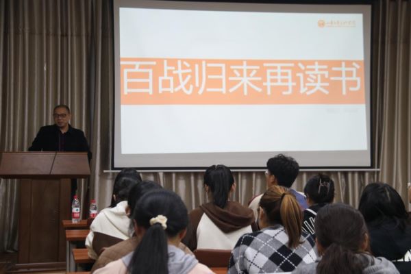 魏克久以自身的经历为基石,向同学们分享自己的志学经验。活动开始,魏克久简单介绍了自己的人生经历。随后,进行了主题为“百战归来再读书”的报告。此次汇报分别从起心动念、落实行动和心得总结三个方面展开。在他的讲述中,我们得知,因为他所热爱的事,因为他所深爱的女儿,更因为他坚信自己的命运可以由自己掌握,魏克久才能在身体和心理的重压之下,仍旧保持丰盈且强大的内心,严于律己、及时检视、坚定目标,最终成功上岸。魏克久说:“一定要相信,付出总会有回报。”魏克久的故事深深的打动了在场的同学们,赢得了同学们热烈的掌声。
