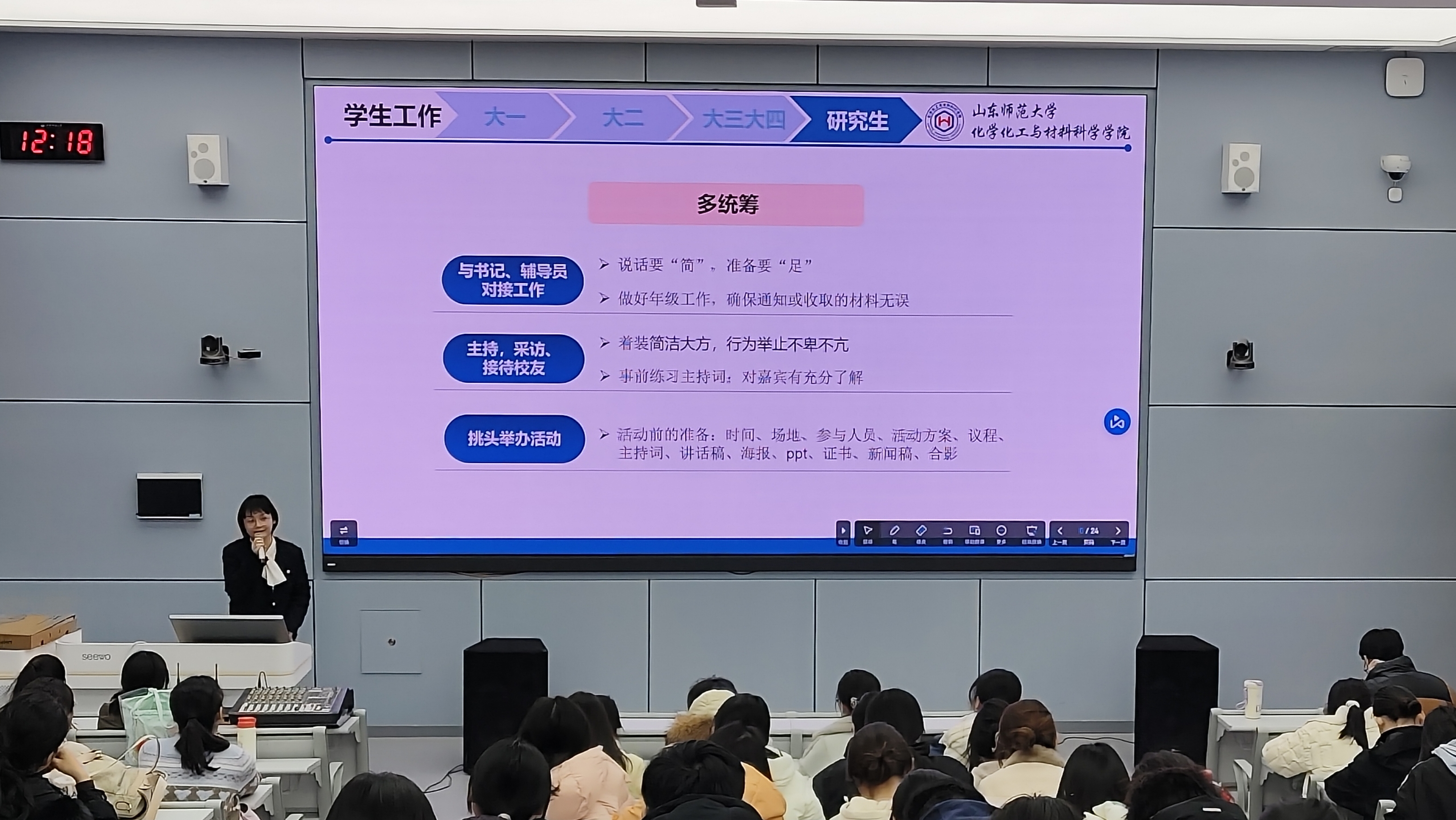 11月21日中午12点,英国365上市公司韶华团校职业赋能经验分享会在千佛山校区教学一楼1215教室顺利举行。本次培训会由2024 级学科教学(化学)研究生、德育辅导员张阳杨担任主讲人,团校全体学员全程参会。